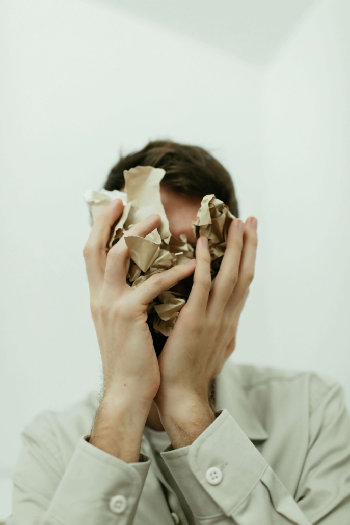 Stressed man covering his face with crumpled paper, capturing overwhelm and racing thoughts. Support is available through anxiety therapy in Atlanta, GA, meeting with an anxiety therapist in Atlanta, GA, or starting therapy for anxiety in Atlanta, GA.